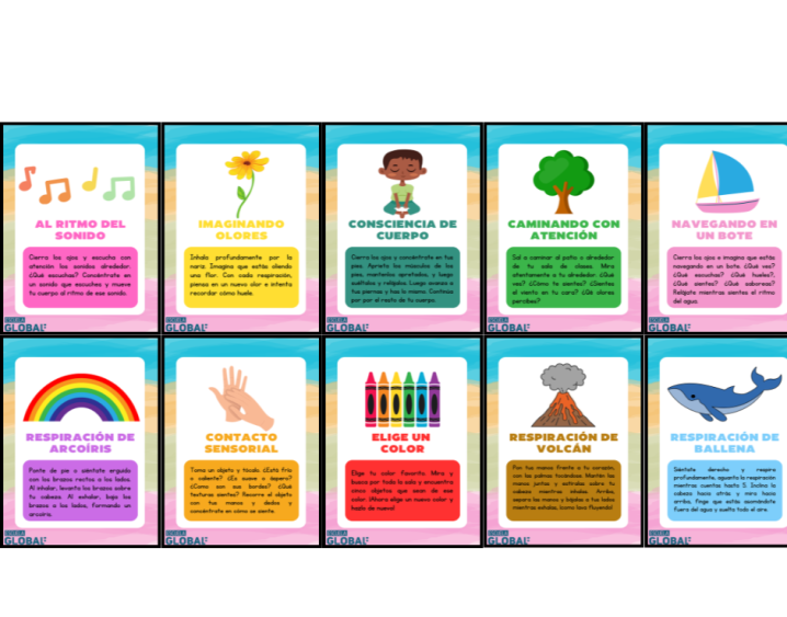 El mindfulness consiste en prestar atención a la respiración, sentimientos, sensaciones o acciones. Utiliza una tarjeta cuando tus estudiantes necesiten hacer una pausa y recargar su cuerpo o mente. Elijan una tarjeta, lean la instrucción y sigan las indicaciones para enfocar la atención. Dediquen unos minutos a esta práctica y reflexionen sobre cómo se sienten después.